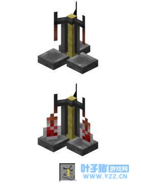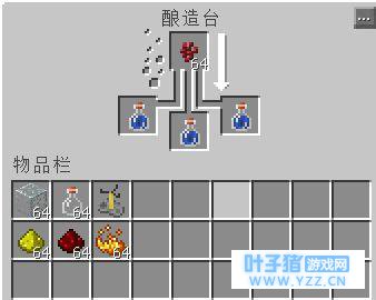 酿制药水必将需要酿造台。用右键点击酿造台将会出现一个酿造界面,在酿造界面中有4个"酿造格子";底部的3个格子用来放置玻璃瓶,这些玻璃瓶必须事先装满水或药水;上方的一个格子用来放置材料以将其提炼到下面的药水中。