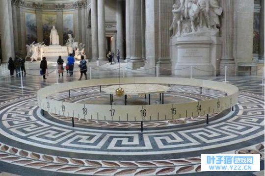 1851年,法国科学家傅科在公众面前做了一个实验,用一根长220英尺的钢丝将一个62磅的头上带有铁笔的铁球悬挂在屋顶下,观测记录它前后摆动的轨迹。