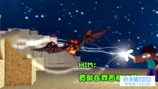 恐惧魔王在我的世界里面也是一个响当当的大人物,玩家碰到它的话都得第一时间选择逃跑。可是迷你龙觉得不甘心,前两个输给它们肯定是方法有问题,这次迷你龙选择了突袭,想要用最快的速度飞起来一脚把恐惧魔王干掉。不过恐惧魔王不是吃素的,走一下位就躲过迷你龙的突击,然后使用手中的石剑直接往迷你龙的头部砍下来,瞬间秒杀! 4、迷你龙VS HIM