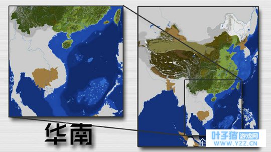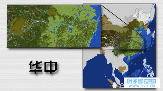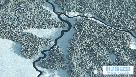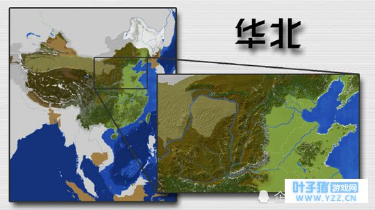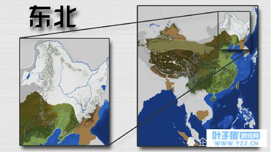 在地图中东北分为白雪皑皑雪原和郁郁葱葱森林。 华北