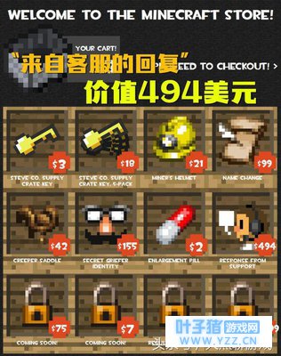 在2011年4月,游戏中曾短暂出现过一种箱子,它被称为“上锁的箱子”!这种箱子有很小的几率在主世界中自然生成,当找到它并打开时,游戏中会弹出一个交互界面,提醒你“现在不”或者“前往商店”!箱子中会出售12种物品,史蒂夫的木箱钥匙(3美元)、矿工头颅(21美元)、增大胶囊(2美元)等等,其中还有一个“来自客服的回复”这个竟然卖494美元!