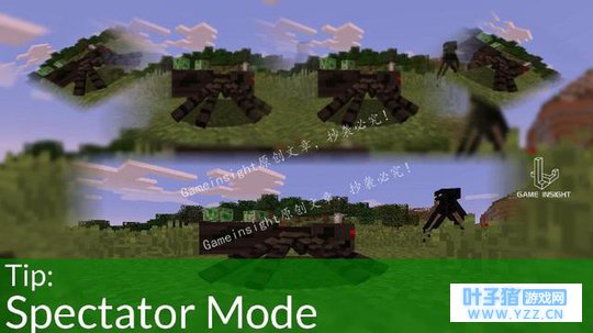 Minecraft存在的唯一一种独特的游戏模式:旁观模式! 它允许玩家心无旁骛地飞行,无障碍通过并观察世界。 如果你在游戏里看到半透明的游魂之头,手里拿着铁镐…没错,那是你的偷窥团伙。 旁观者既能看到其他旁观者和隐形的生物,还能在第三人称视角看到自己。
