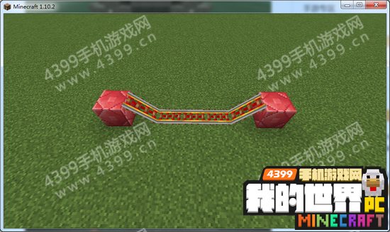 2.然后左右两端放一个方块,在方块上方放铁轨,让左右两边的铁轨都上翘,再把方块上的铁轨打掉。