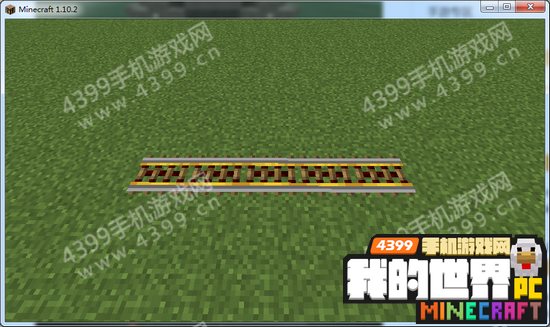 3.然后两端铁轨上方摆放两格方块作为窒息方块,两端方块上再放一个方块放置矿车跑出铁轨,中间放上矿车,推一下让矿车动起来。
