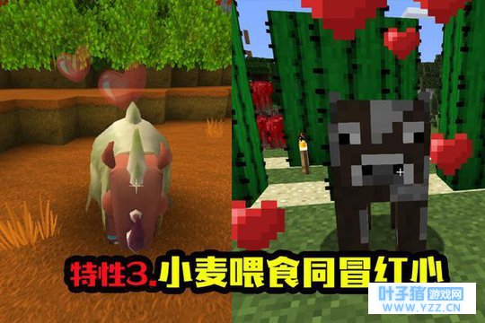 我的世界中能驯服喂养很多生物,迷你世界中同样也可以。打个比方在驯服“牛”这种生物上,mc中是使用小麦右键喂给牛吃后产生红心。而在迷你中驯服“野牛”,竟然也一模一样!一样是用小麦喂食,一样是出现红心,这真的是太“巧”了! 特性4.水的特性
