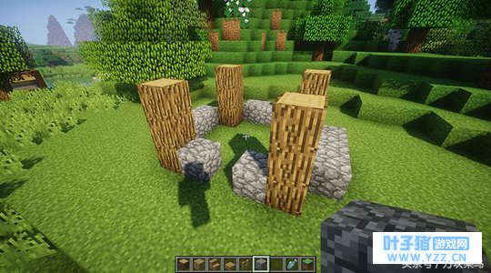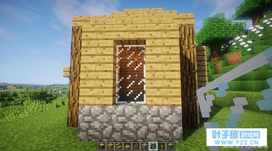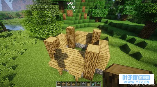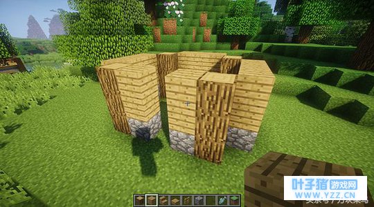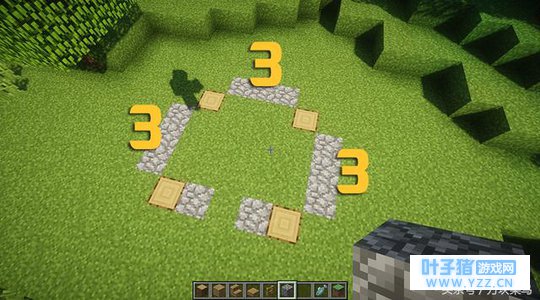 首先在圆石地基上摆放1格高的圆石,在橡木地基上摆放3格高的橡木。(注意入口处的圆石摆放位置与其它三面墙不同)
