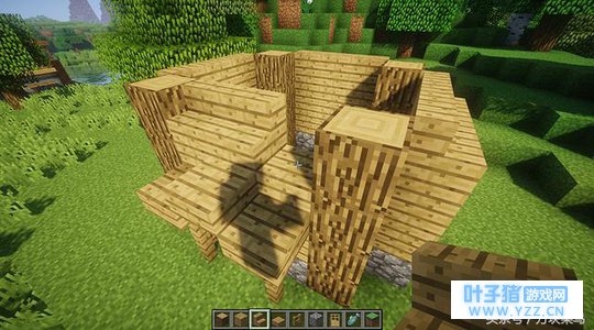 继续建造屋顶部分,在4个橡木柱子上增补1格高橡木方块,再用橡木楼梯在全部橡木木板上摆放1格。