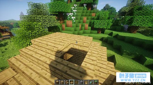 继续用橡木楼梯向上,并向内摆放1圈,中间的天井用橡木台阶封堵,使整个屋顶成为一个斜坡状。再为入口两侧的橡木柱子上摆放1格高橡木台阶作为装饰。