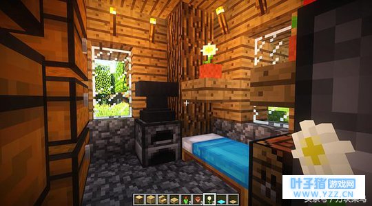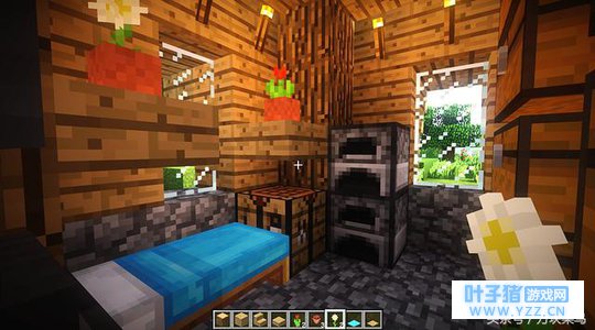 室内的地面铺上圆石,在入口的两侧摆放8个大箱子,满足存储的需求。再摆上床、工作台、熔炉、铁砧满足生存需求,另外可以摆放点花花草草,使屋子里充满生机,不过这个看个人喜好吧。