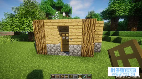 在所有圆石块上摆放2格高的橡木木板作为围墙,入口处的顶部用橡木楼梯连接,下面摆放木门,并用橡木台阶和橡木栏杆给门口做个雨棚。