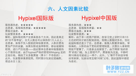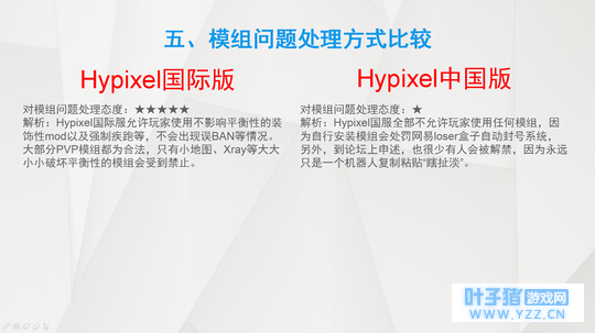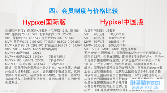 原版 Hypixel国际版 VS Hypixel中国版(仅限中国境内) Hypixel中国版优点 1、延迟低 1 2、语言无障碍 1 3、免费 1 Hypixel中国版缺点 1、游戏内容单调 2 2、游戏更新速度慢 2 3、所有会员都为月费制度 4 4、除了限时的等级任务奖励的硬币加成器,硬币加成需要会员,自身无论等级多高也没有永久硬币加成 3 5、没有全服硬币加速器3 6、黑客大肆泛滥,玩家游戏体验感差6 7、志愿者客服管理员的服务质量低劣6 8、为了实现“中国特色”强制安装一些拖慢游戏性能的模组,然而一些专业PVP模组官方并没有自带;自行装的模组无论在国际服规不规范,都有可能被盒子封启动器 5 9、玩家数量有高峰与低谷期,工作日人数较少,只有到周末人数才会偏多些,因此匹配游戏相对较难 6 10、玩家整体素质低,经常讨论别人的父父母6 11、神秘宝箱除了等级奖励,只能通过充钱获得,玩多少局游戏基本上都无法获得 12、客服经常滥用权限,不封外挂封高手玩家6 Hypixel国际版优点 1、游戏内容丰富 2、游戏更新速度快 3、除MVP++其他所有会员终身制度 4、个人硬币加成不需要会员,只需要游玩到一定等级便可解锁永久加成,亦可使用等级任务奖励的限时硬币加成器 5、拥有全服硬币加速器,一个人购买,其他任何人都可以享受到福利 6、黑客稀少,游戏公平性高 7、志愿者客服管理员的服务质量优秀 8、自行装合法模组几乎零风险(如强制疾跑,药水显示,反砍动画),只有不规范的模组才有可能被封 5 9、玩家数量全天保持在几万,几乎没有低谷期,因此匹配游戏很容易 10、玩家整体素质高,说话很幽默 11、神秘宝箱除了等级奖励,亦能通过游玩游戏或充值获得 12、客服要求严格,不会乱封无辜玩家 Hypixel国际版缺点 1、延迟高 2、语言一定问题(Hyp有汉化,此问题可忽略不计) 3、需要正版 165RMB(不要说黑卡,黑卡容易暴毙)