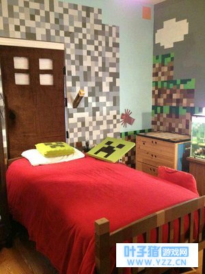 首先来看看这个玩家的房间:简单一瞥我们可以看出这个房间并不大,但很整洁,到处的充满着MC的元素:墙纸是MC圆石、台阶,抱枕是苦力怕,床头柜则是工作台。。。墙上还有一个“火把”,应该是灯的开关,很有创意。