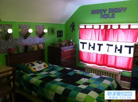 这个房间的小主人一定是一个很有品味的MC玩家,房间整体看起来很有质感,墙壁上的砖石简直就和《我的世界》山洞里的质感无差,墙壁还插着火把,还有一副苦力怕的照片,很可爱;床单上的巨型史蒂夫太醒目了,床头上还有末影人、猪、苦力怕、史蒂夫样子的抱枕或玩偶,看到这么有趣的搭配,我都想在这个房间里睡上一觉了,那感觉肯定既真实又梦幻!