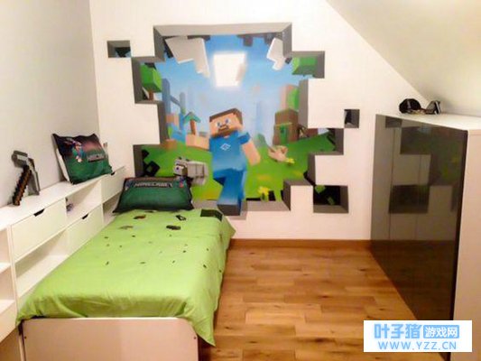 这同样是一个简洁、干净的房间,整体的风格较为时尚,而墙壁上”破墙而出“的史蒂夫可谓是整个房间的画龙点睛之笔了,看起来十分真实、醒目,乍一看,还真以为有人手拿镐子敲破了墙壁了。另外,”苦力怕“床单和床头柜的镐子都很漂亮,显得童趣十足。