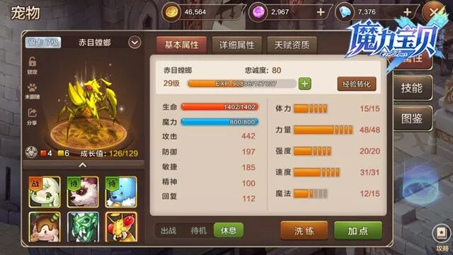 3 那在宠物洗练上有什么经验可以分享吗? 攻宠 首先要保证 满力量 、 速度 与 体力 ,有多余的洗练药水了可以洗到满档,不过攻宠掉魔法无关紧要。 同样 魔宠 首要保证 满魔 、 速度 与 强度 ,可锁定这三个满档的在力量和体力之间博弈,如果不是强迫症的话,魔宠掉攻是完全ok的~