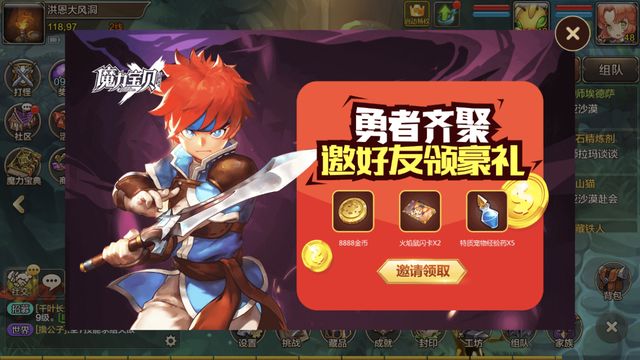 福利内容 ?成功邀请一位好友: 金币x8888; ? 成功邀请 二位好友: 宠物天赋转化药水x1; ? 成功邀请 三位好友: 矿洞钥匙x1; ? 成功邀请 四位好友: 伐木通行证x1; ? 成功邀请 五位好友: 火焰鼠闪卡x2; ? 成功邀请 六位好友: 特质宠物经验药x5(绑定)。