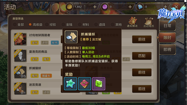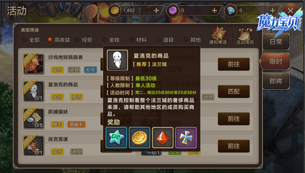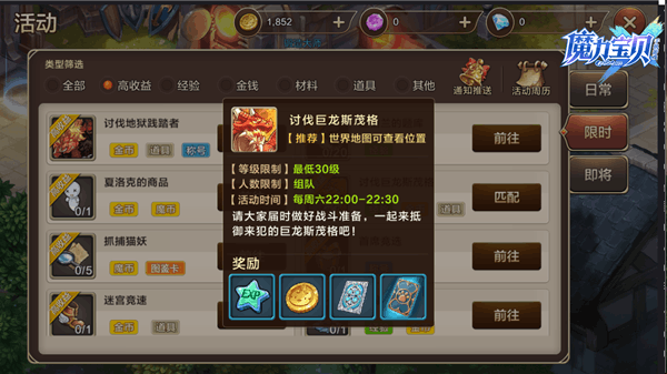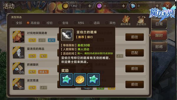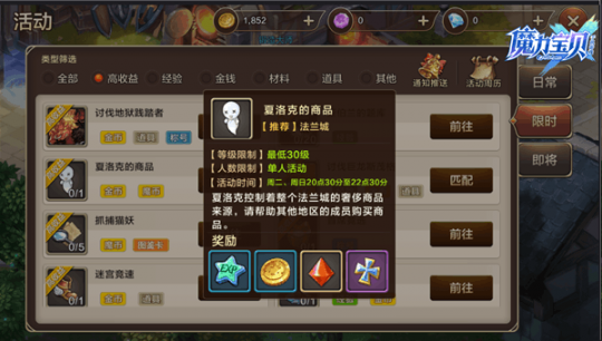 按照游戏的通性,活动越稀少,越珍贵,奖励自然也更加丰富,因此当出现了限时活动,小伙伴们可不要错过了哦,特别是一些珍贵材料只能通过限时活动才能够获取,面对于小伙伴们对于限时活动的了解度不是很高,因此将在下文一一为大家进行讲解。 【讨伐地狱践踏者】 等级限制在25级以上,要求玩家选择组队,只能在每天的12点到12点半与20点到20点半能够执行任务,这代表每天只有一个小时的时间来完成任务。任务奖励为宝石、装备打造高级材料、魔族的水晶。这些材料都属于打造装备的珍贵材料,为装备的等级与属性提高极其重要的帮助,缺一不可,所以可不要忘记这个任务哦~ 【亚伯兰的题库】 这个限时活动限定时间在周一与周四的20:30分到22点30分,相对于万事通的考验,亚伯兰的题库提供的奖励更加丰富,经验与金币的获取量远远高与万事通的考题,当然其答题难度比亚伯兰的考题也难上不少,所以小伙伴们一定要熟练游戏,这样才能以王者的姿态面对这些题库,获取更多的奖励。 【夏洛克的商品】 夏洛克的商品的限定时间在周二与周四的20点30分到22点30分,任务内容是帮助其他地区的成员购买商品,任务奖励除了金币、经验以外,还有魔石与声望,不仅仅为装备打造提供了便利,也为职业晋升提供了方便。 【讨伐巨龙斯茂格】 巨龙斯茂格在每周六的22点到22点半会入侵魔力宝贝世界,需要所有玩家们届时做好战斗准备,一起来抵御魔龙。每周玩家们只有半个小时的时间来完成任务,自然它的奖励也弥足珍贵,宠物图鉴卡与普卡封印卡二者让每周的这半个小时格外充满意义。等级低,宠物少的玩家们可不要错过哦。 【抓捕猫妖】 抓捕猫妖的任务内容是帮助鲁修斯队长抓捕盗宝猫妖,在每周三与周五的五点限时开启,奖励有猫妖小袋与异次元水晶。前者打开有几率获得水晶碎片,宠物图鉴卡,装备打造材料,摩币、宠物与封印卡等奖励。 在小伙伴们看完文章中,明显可以看出,限时活动时间一般都在中午12点,晚上8点与10点这三个时间段,也是小伙伴们最佳的休息时间,休息之余,完成限时活动获取丰厚奖励,又不耽误休息,岂不美哉。所以可要好生记得活动时间哦,不要错过这么好的机会啦。 |