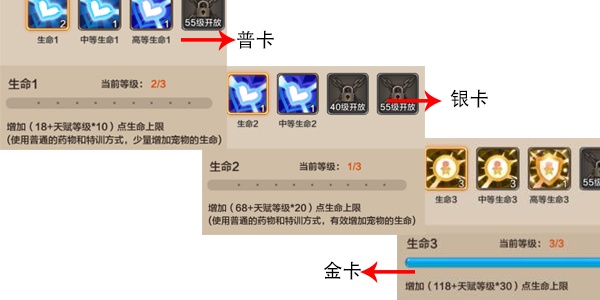 【叶子猪原创稿件,转载请注明出处】 魔力宝贝手机版中玩家可以根据自己的职业和喜好,自由选择宠物进行封印。在游戏里,宠物会与玩家并肩作战,无论做什么任务都需要宠物帮忙。挑战任务需要血宠抗伤害,挂机刷野则需要暴力宠物清野。那魔力宝贝手机版中后期该如何选择宠物呢? 魔力宝贝手机版宠物分为普卡、银卡、金卡三个种类,分别需要对应的封印卡进行封印。虽然每一类中都有成长、资质比较好的宠物,但是游戏后期依旧会产生较大的差距。 不同卡种宠物的成长对比: 成长直接影响着宠物属性,成长越高,那宠物每升一级加的属性就会越高。随着宠物等级的提升,属性会拉开很大的差距。经过角色的宠物强化技能加成后,属性差距会更明显。比如40级的金卡猫熊与44级的普卡穴熊相比,虽然有等级差,但猫熊的攻击力依旧高于穴熊。 另外三个卡种的宠物在天赋资质也有区别,普卡的天赋资质为1级、银卡为2级、金卡为3级。小编举个例子:普卡的穴熊生命1的加成为【18+天赋等级*10】,银卡的武术仙人掌生命2的加成为【68+天赋等级*20】,金卡猫熊生命3的加成为【118+天赋等级*30】。同样其他的天赋也会有加成差距,金卡要优于其他卡的宠物。 看完这些之后你就知道,为什么黄蜂、赤目螳螂和水龙蜥只能做过渡宠物了吧!那在金卡宠物中哪些值得培养呢。 血宠推荐:黄金树精 黄金树精体力五颗星、强度三星半,非常适合做血宠。推荐加点:全体力加。推荐天赋:生命。技能推荐:明镜止水、护卫、圣盾。不建议混加点到强度上,强度的资质并不强,全加体力,可以扬长补短。 攻宠推荐:猫熊 猫熊虽然在PK中因为种族的克制无法登场,但是在日常任务中,猫熊绝对是一个强力打手。力量五颗星、体力四颗星。推荐加点:全力量加。推荐天赋生命、攻击。推荐技能:乾坤一掷,崩击,吸血、反击、连击。 魔宠推荐:丸子炸弹、纯白吓人箱 丸子炸弹魔法五颗星、速度两星半。纯白吓人箱魔法四星半、强度四星。这两个作为魔宠都是不错的选择。加点推荐全魔法。技能根据元素克制搭配,有单法有群法就可以。 敏法宠推荐:丘比特 丘比特魔法四星半、速度四星半。敏是所有宠物中最高的,可以培养成控制宠和魔宠。魔宠的培养方式根据上文推荐即可。控制宠利用超高的速度打出先手控制效果,在PK中非常吃香。技能推荐:石化攻击、混乱攻击、醉酒攻击、明镜止水、战栗袭心。 猫熊和丘比特不容易获得,如果不想氪金的话,可以选其他的金卡宠物。亲爱的小伙伴们,关于魔力宝贝手机版中后期宠物的选择,你们学会了吗? |