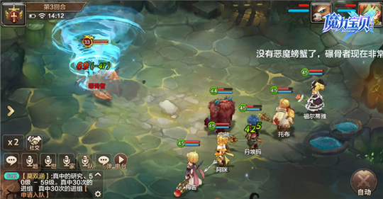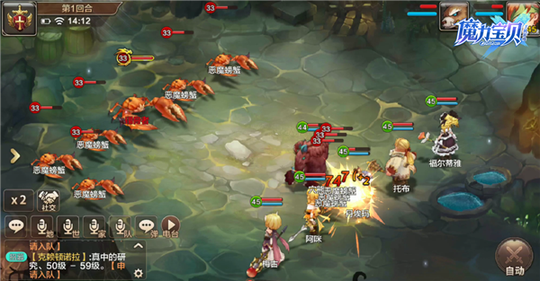 图 2 :对方输出展示 (1) 宠物方面推荐螳螂或血宠,选择螳螂可以帮助勇者集火恶魔螃蟹,降低敌方输出总额。带血宠可以护好勇者,保证勇者的输出。就实际效果而论,携带螳螂会是更好的选择。毕竟有了螳螂的高伤害,在后续打 BOSS 也会轻松一点。 (2) 伙伴方面推荐:斧头 +2 魔法师 + 剑士,这里没推荐格斗是因为格斗的伤害并不高,并且输出范围也没有魔术师大。而魔术师的选择推荐上一个梅古,毕竟螃蟹是有火属性的哦!梅古的冰系魔法具有元素相克的伤害加成,这样伤害输出就会比较高。至于为什么带剑士,主要是前期的伙伴不多,剑士能输出又能抗所以是一个不错的选择。 【过关策略分享】