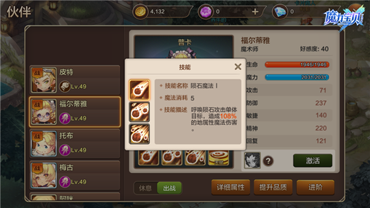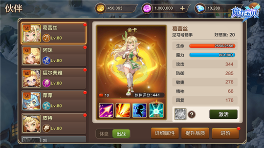 (图 3 :弓箭手职业伙伴) 2. 选择“弓箭手”伙伴上阵的原因有两点,其一是“弓箭手”拥有较高的敏捷,可以先手攻击敌人奠定优势。其二是“弓箭手”可以攻击到敌方后排!不过在当前游戏中符合该要求的伙伴就只有一个,那就是葛蕾丝。目前葛蕾丝只能通过商店购买获取,售价为 6480 钻石。这个价格对于某些勇者来说可能相对较贵,但是与其实用性相比这个价格就不值一提了。如果勇者无法入手葛蕾丝,那么可以使用其他“重装职业”伙伴替代。 3. “魔术师”职业伙伴在单体、小范围和群体输出上拥有一定的优势,可以轻松应对各种复杂的战斗环境。不过唯一的劣势就是”魔术师”职业伙伴不像”魔术师”一样可以学习多系魔法,这就存在一定的局限性,毕竟游戏中的元素克制还是非常给力。因此在挑选“魔术师”职业伙伴之前一定要明确敌方的元素占比情况,这样才能从容的进行的选择。不过按照目前情况来看地系魔法师”福尔蒂雅”的出场率最高,勇者不妨重点培养一下。