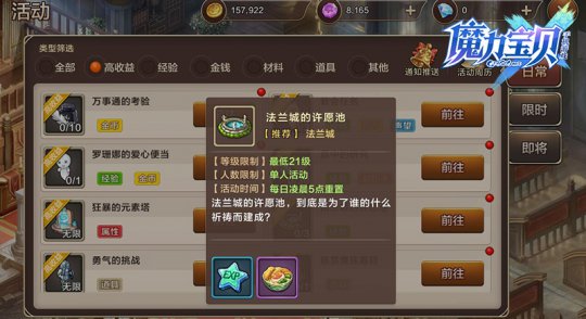在《魔力宝贝手机版》的异世界中,法兰城是整个法兰王国的核心,也是勇者们初次踏入法兰王国的地方。在法兰王国的中心,有一座神奇的许愿池,相传在这个许愿池内投入金币,它就会回馈给勇者意想不到的奖励。走过路过千万不要错过。 当勇者们到达21级,点开活动面板,就能在高收益活动内找到法兰城的许愿池。点击前往即可直接传送到位于法兰城正中的许愿池。许愿池边的少女芙格会指导各位勇者如何在许愿池进行许愿。 勇者们每天可以再许愿池许愿3次,每次许愿均可以获得丰厚的奖励,还有意外的限时增益buff哦~法兰城的许愿池是每日必做的高收益玩法。任务过程非常简单,收获颇丰,推荐勇者们日常完成。 |