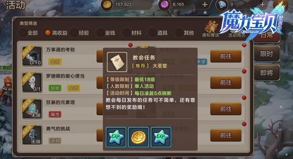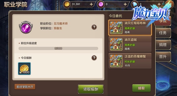 在魔力宝贝的世界中,每个职业到一定等级,都需要进行直接晋阶,晋阶过后,角色的能力会得到提升,同时还会新增一套全新的晋阶外观。职业晋阶除了要求勇者的等级之外,还需要有法兰城对应声望。而在手机版中,法兰城声望又是通过什么方式获得的呢?今天,小编就将集法兰声望与人物经验于一身的、人见人爱的“学院任务”介绍给各位法兰城的勇士们。 当玩家角色等级达到18级后,在“活动”界面就会新增“学院任务”选项。该活动为单人完成,每日凌晨5点刷新,奖励大量经验、金币、以及法兰城声望,是每日必做的任务。 点击“前往”按钮,勇者便会自动寻路前往骑士团大厅接取任务,每天可以接到3个任务,可以看到任务奖励非常丰厚。接取任务后,点击任务。 |