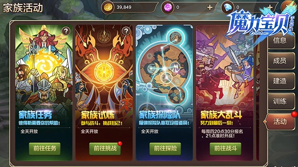 你是否在游戏中体验过想刷本却找不到队友的绝望?你是否明白主线被卡却没人帮忙的无奈?你是否在魔力中感觉这是一个“单人游戏”?要是你也存在这些问题,那么你就需要加入或者建立一个家族了。 家族不仅能聚集一批兴趣相投的伙伴,还可以解决下本没人组队,主线没人帮忙的难题。当然家族可不光只有聚集伙伴的功能,它本身还拥有不少有趣的玩法哦!下面便来全方位的了解一下家族系统的相关玩法吧! 【家族简介】 1.成员权限 家族中分六个职位:族长、副族长、长老、骨干、精英、普通成员,拥有管理权限的只有族长、副族长、长老,这三个职位能够同意申请的小伙伴加入家族,也可以请离成员、编辑成员信息、升职降职。不过族长可以操作其他所有职务,副族长只能操作除族长外的职务,长老同理。这里需要注意,族长只有自己辞职,不然谁也无法对族长进行撤职哦! 2.家族建造 小伙伴刚刚创建家族之后,家族只会有家族小广场和家族宴会厅两个建筑,而家族商店、家族探险队、家族海港、家族空港都需要家族管理者进行建造。不过想要建造这些建筑,需要消耗不少的家族建筑点,想要获取家族建筑点小伙伴可以通过捐献来获取。达到足够的建筑点后家族管理者就可以开始建造这些建筑。 3.强化训练 该功能是培养宠物的绝佳手段,小伙伴可以通过消耗一定贡献点,让宠物到家族强化训练中进行经验的获取。也可以消耗一定贡献点来提升家族训练的效果,如从1只宠物的训练提升到2只,效果从10%提升到20%等。 【家族活动】 1.家族任务 小伙伴每天可以在家族大总管处领取,家族任务一共二十环,每完成一环就可以获得道具、经验、家族贡献点等奖励; 2.家族试炼 每位家族成员每天只能参加一次,而活动内容便是对一只魔物进行击杀,想要在这个活动中拿到不错的奖励,成员们必须齐心协力一同对魔物进行输出。每个成员都能获得参与奖励,如果成功击破BOSS,还能获得击破奖励。 3.家族大乱斗 大乱斗相比其他两个活动有所不同,该活动仅限周四晚上八点半到九点开放,若错过这个时间段家族成员们就只能等下周的活动了,活动中成员们需要进行疯狂的战斗,成员在战斗中坚持的越久,最终的奖励也就越丰富,所以成员们努力坚持到最后一刻吧! 除此之外还有家族探险队、家族荣誉战等丰富的活动玩法,未来也会相继开放更多,勇者们赶快行动起来,进入家族体验不一样的魔力玩法吧! |