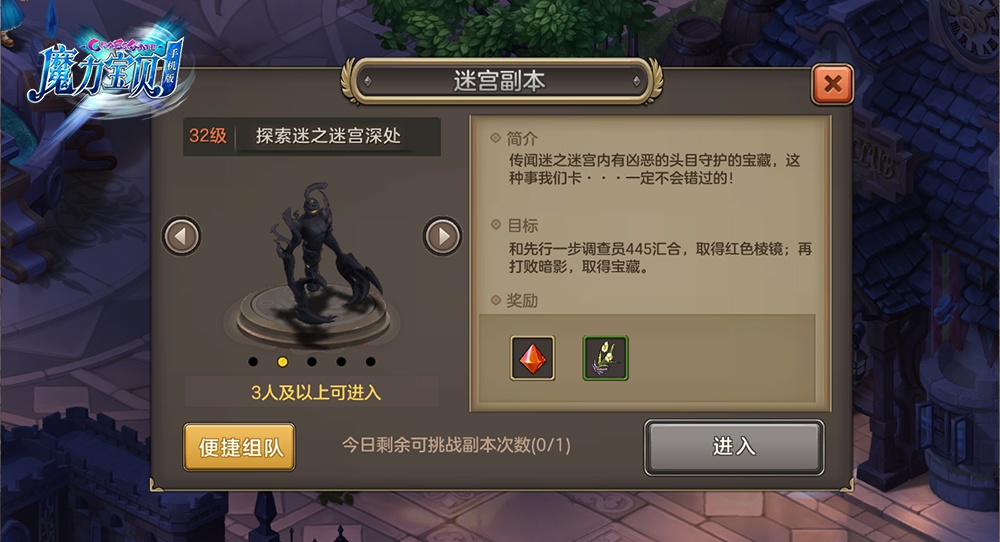 《魔力宝贝手机版》经典玩法大回归,神秘的探索迷宫玩法将现法兰城啦!神秘的调查员委托玩家探索随机迷宫中隐藏的宝藏,机遇与危机并存的迷宫中拥有怎么样的未知东西等待着大家,一起来看看吧。 探索迷宫在玩家达到16级后开启,玩家需进行组队(最少3人)且队伍成员最低等级≥副本要求等级。在组队条件中,进入副本时全队无暂离队员并每?限制可进?副本?一次。 玩家可根据任务索引,先达到目的地与调查员汇合,通过取得红色棱镜来开启BOSS,打败暗影。玩家在确保拥有“钥匙”才能开启BOSS房间,挑战BOSS并获取宝藏。 可能很多小伙伴会对BOSS房间钥匙的找寻感到疑惑,玩家可通过找寻地图中的各种NPC来获取线索,通过线索来获取房间钥匙。 如若碰到“先遣队员”,则可通过他来领取到已发现的线索,运气好会直接给到玩家BOSS房间钥匙。 BOSS房间钥匙多为红?色棱镜、古代王族的?血壶等,该道具在活动中进行获取,主要用来进入迷宫的BOSS房间。没有这类道具时,将?无法通过传送?石或守卫,进?入BOSS房间。 探索随机迷宫的玩法并非单调死板的固定活动,该任务会根据队长等级来接取任务。 随机迷宫玩法目前分为16级、32级、40级、50级、56级五个活动玩法,根据等级与地图的不同,所碰到的怪物级别与BOSS类型也大不相同。 谜之迷宫的怪物均以虎人、猫妖为主,而最终BOSS为暗影;沙尘之洞的怪物为风蜘蛛、地狱骷髅为主,最终BOSS为旋律影子;沙漠之祠庙的怪物为杀手蝎、木乃伊而最终BOSS为狂战将军。 在副本游戏玩法中,地图不同所碰到的场景及触发内容也大不相同噢。更有部分玩法需考玩家脑力,通过动脑筋解开谜题来获得更多的游戏奖励。 |