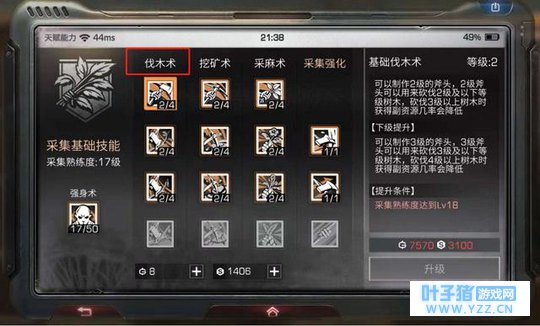 采集天赋加点推荐: 采集天赋分为伐木术,挖矿术,采麻术和采集强化四大类别,在游戏的前期阶段,第一排是基础,这个肯定是要点满的,因为这一行前期会涉及到你的制造工具等级,工具等级是可以限制你的采集物资的等级的,因此,第一行基础天赋一定要点满。 第二行中前期可以优先加点蓄力砍伐,这样可以加速你的采集速度,一般用蓄力砍伐,一个蓄力可以秒开一棵树木或者一块矿石,效率贼快,前期的发展速度是很重要的,很多玩家在这一行中都会选择加点快速砍伐,其实快速砍伐效果非常不明显,绝对是没有蓄力砍伐的效率快。 第三行和第四行,这两行是增加副资源的出产概率,因此没什么好解释的,能点多少就点多少,另外,在强身术上,这个毋容置疑都是必须要点满的。