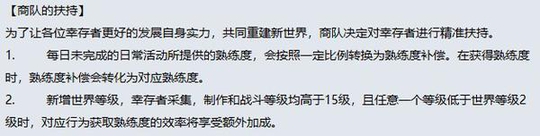 商会精准扶持其次,商队即将对幸存者进行精准扶持,第一条就是玩家每日未完成的日常活动所提供的熟练度,会按照一定比例转化为熟练度补偿。在获得熟练度时,熟练度补偿会转化为对应的熟练度,但是目前具体的补偿标准还没有公布。