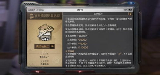 【世界熟练度机制】 《明日之后》版精准扶贫,也是为各位幸存者减负的一个小机制,世界熟练度可通过点击个人头像-生存能力右侧的小标志查看。这样一个机制的上线可谓是新手玩家的福音,幸存者也不用担心自己当天任务没有做完。