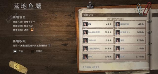 【营地鱼塘】 每个营地的鱼塘位于晶粒湖畔,在营地内钓鱼会获得采集熟练度和珍稀鱼类,二者数量有上限。开放式鱼塘可以邀请他人一起来钓鱼。在营地鱼塘npc处,幸存者可以购买鱼饵,兑换虾饵制作配方。家门口也能钓到锦鲤,看来晶粒湖畔的房价势必要大涨!