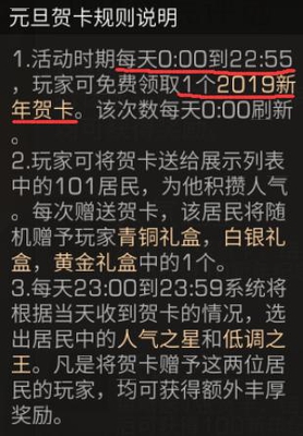 接着咱们看看”新年贺卡“的活动:活动每天0:00到22:55玩家可以领取一个新年贺卡,记得千万别在最后5分钟在领取,那时候就领不到了没用啦。新年贺卡可以用于送给101居民,然后根据人品,居民会返送给你3个礼盒中的一个,分别是青铜、白银、黄金。