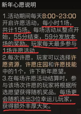 在来就是新年心愿:这个许愿活动每天会有15场,每小时会有一场,都是整点开始,55分结束,59分在发放奖励。别看有这么多场,其实咱们每天只能参加一场,所以咱们只要在当天的早上8点到晚上11点这个期间许愿就行,其它不管它和我们没关系(哦对了,55分到59分是不能许愿的系统在结算)