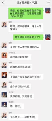 各位幸存者 之前看完NPC们的圣诞朋友圈 是不是对他们有了新的认识? 有很多幸存者留言夸 邮寄小哥好可爱 明明都嫉妒啦~ 为了“揭露”幸存者们的真面目 明明冒死潜入了他们的微信群 给幸存者们带来新鲜出炉的截图 有超多八卦噢! 过好末世生活,从关爱NPC做起