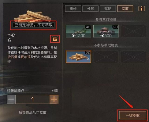 3.可用锁定功能将物资分为 参与萃取与不参与萃取 按下一键萃取 参与的物资将一键萃取出赋能点