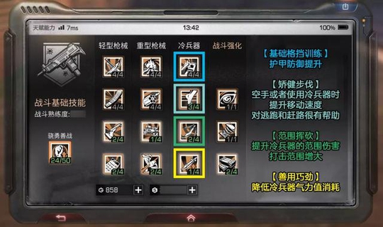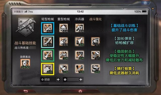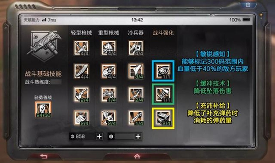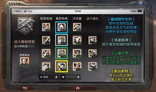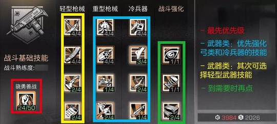 最优先级 在战斗天赋的选择上 最优先级为骁勇善战 武器类技能 可以优先强化弓类和冷兵器的技能 因为这两类武器的耐久消耗比较低 而且伤害也很不错 对于缺少弹药补给的末世生活来说 可以节省武器成本的了 其次可优先选择轻型武器技能的升级 轻型武器的数量多 而且战斗的伤害和战斗经验的获取 都是较为不错的 需要时点亮 战斗强化 对于生存能力和战斗能力的提升 也是很有作用的 (以上攻略由玩家提供,不代表官方立场)