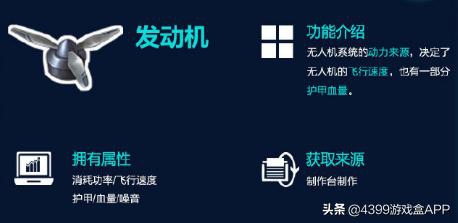 发动机:无人机系统的动力来源,决定无人机的飞行速度。一个好的发动机决定一台无人机的高度,要想获取发动机那就去找制作台自己动手制作吧。