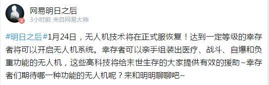 明日之后新的一轮更新即将到来,这次更新将加入新的高科技装备。就在昨天官方发出消息称,无人机将在1月24号上线正式服,一人一狗一无人机,瞬间感觉高大上呀!