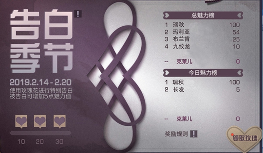 告白成功后,不仅将增加双方 魅力值 。魅力值排名 “今日榜” 和 “总榜” 前20 的幸存者,还能获得 荣誉称号 、 节日时装 等奖励。