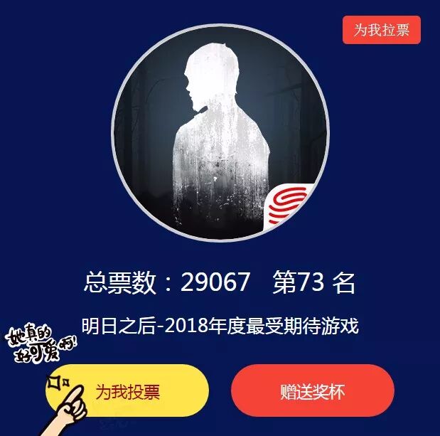 是的,《明日之后》正在参选 2018年度最受期待游戏 还在持续投票中哦~
