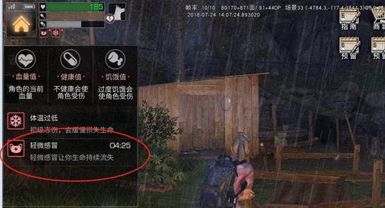 不论身处营地还是郊外,你都有可能遭遇下雨天气。下雨的时候在野外探索采集,可能会获得 雨天独有的特产资源 ;但是如果 被雨淋太久也可能会感冒 ,感冒还可能发展成 肺炎 ……嗯,所以各位幸存者身体状况不佳时,还是趁早找个 避雨的地方 吧!