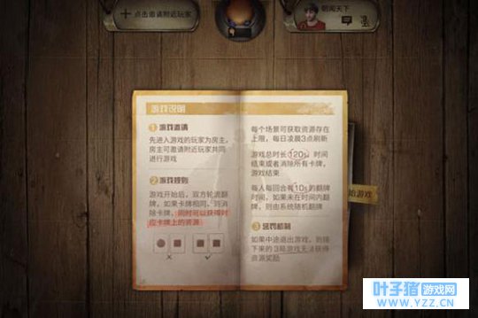 1.游戏开始后,玩家会看到一些背面朝上的卡牌,双方轮流翻牌,如果卡牌图案相同,则消除卡牌,如果卡牌图案不相同,则两张卡牌翻回背面,重新翻牌; 2.每局游戏开始时,随机一个玩家先手翻牌,对应玩家左侧头像会有标记; 3.游戏总时长120s,时间结束或者消除所有卡牌,游戏结束; 4.每人每回合10s的翻牌时间,如果未在时间内翻牌,则由系统随机翻牌;