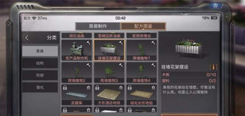 1、首先我们要 集齐挂墙花架摆设的配方材料 ,做挂墙花架摆设需要10个木板,2个塑料。 2、材料集齐,就可以去营地家具店的 家具制作机 上进行制作了。 ps:营地达到蛮荒时代可解锁。 家具作用: 美丽的花架挂在墙壁,尽管没有什么用,也是让人心情愉快。 总结:挂墙花架摆是有木板和塑料制成的,一般起到美化卧室的作用。 |