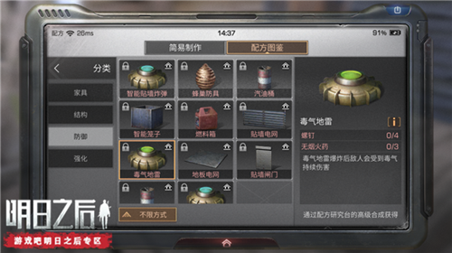 明日之后毒气地雷怎么制作?气地雷的作用很大,能够释放出使人持续扣血的毒气,小编给大家带来了毒气地雷制作方法介绍,下面一起来了解吧。 明日之后毒气地雷制作配方介绍 建筑名称:毒气地雷 制作配方: 螺钉4个、无烟火药3个