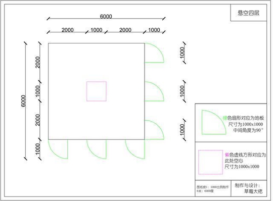 三层为最关键 所在,地板占地面积为5x5,边缘用栅栏围起,空出周围用6个弧形地板装饰,用于挂置二层吊灯。 在后半部分取3x2空地用半身墙搭建一个房间(房门为正常墙体),再在旁边取2x3空地,用小矮墙搭成二阶阳台,门口架立两个立柱,添置天花板,可放两个遮阳伞。