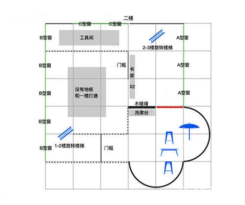 一楼最特别的在于她把卧室的位置抬高了半层,用了4个木矮墙和1个矮楼梯,层次感一下子就出来了。 卧室的对面是一片开放式的客厅,利用柜子做了巧妙的空间分割。 当墙壁数量不够支撑地板的时候,可以利用门框做支撑点,不一点要盖实墙。 二楼平面设计图: