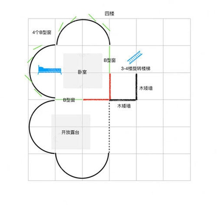 四楼给第二颗爱心盖了顶,变成了开放式的露台。 第三颗爱心的内部,设计成了卧室。 五楼设计图: