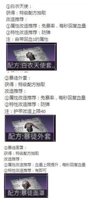 二.特级配方: 1. 武器类: AK-47突击步枪: 获得:特级图纸抽取获得,抽取难度:非常低 武器皮肤: A. AK47雨战涂装:特级配方抽取,抽取难度:低 B. AK47雪地涂装:特级配方抽取,抽取难度:低、 C. AK47典藏涂装:特级配方抽取,抽取难度:中 改造推荐: 属性改造推荐:暴击率,爆头伤害提升 特性改造推荐:毁伤,精致