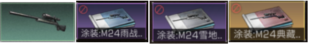 M24狙击步枪: 获得:特级图纸抽取获得,抽取难度:非常低 武器皮肤: A. M24雨战涂装:特级配方抽取,抽取难度:低 B. M24雪地涂装:特级配方抽取,抽取难度:低 C. M24典藏涂装:特级配方抽取,抽取难度:中 改造推荐: 属性改造推荐:暴击率,爆头伤害提升 特性改造推荐:毁伤